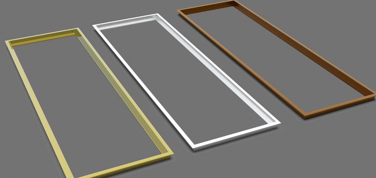 Рамка имеет фланец 13 мм и основание для установки рулонной решетки. Определяющими размерами являются внутренние размеры конвектора. Профиль поставляется цельным изделием в виде рамки. Возможна поставка погонными метрами кратно 3 метрам.